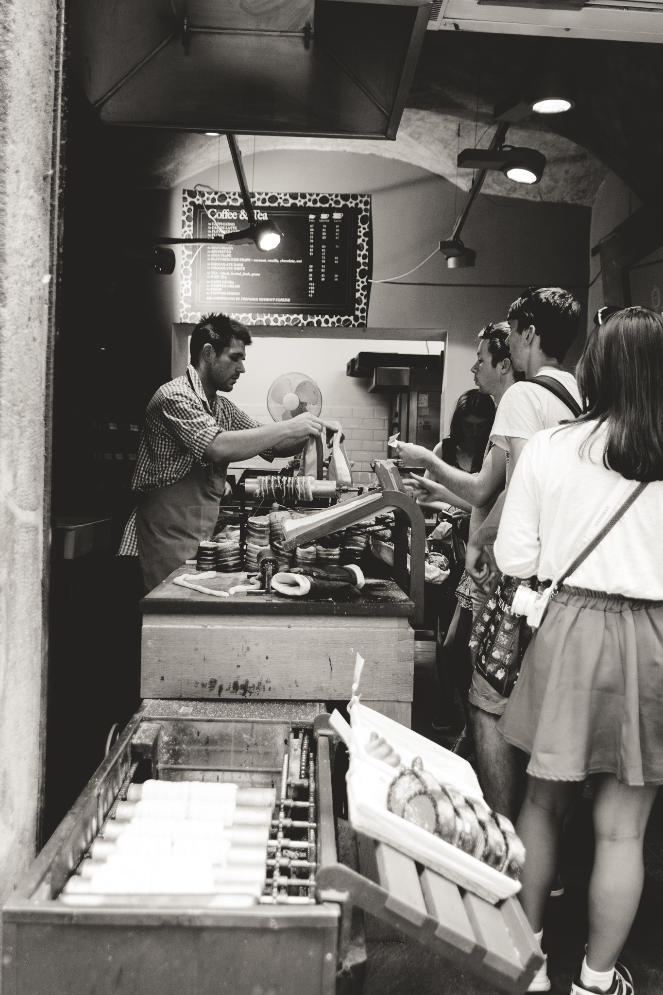 After walking down from the hilltop, we enjoy a freshly squeezed juice and sit on a park bench watching the world go by. We then stumble across some food markets where we all eat a hot dog and try out a ‘Trdelnik’ which is a traditional sweet pastry made from rolled dough and covered in sugar and walnut mix!